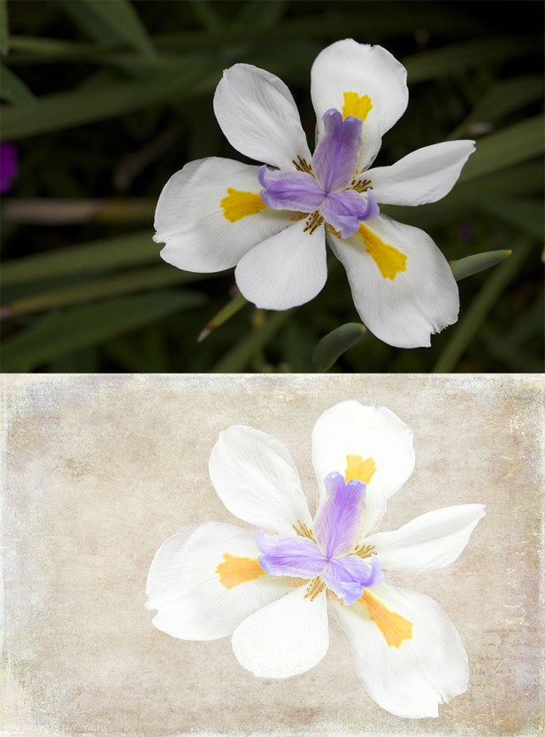 It has a much different feel than the original, which probably would have been just fine with a little exposure boost, but I wanted to end up with something a little “artier” (or is the word “artsier”?). During the process, I got the flower looking like I wanted it to, but the background just seemed drab, but I discovered that if I selected the Pin Light blending mode for a texture, it pretty much covered the background. All I needed to do was add a little layer mask on the flower and voila… a new background. Maybe I went overboard with the number of textures I used — and I won’t even tell you how many hours it took me — but I like the result. Here’s a side-by-side before and after shot.