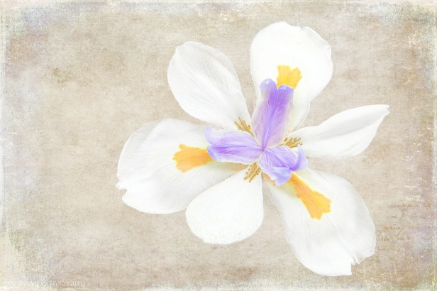 This was shot on a cloudy day but I liked the composition of the shot, how the flower stood out against the dark background. It was a wee bit fuzzy but all-in-all something I thought could be salvaged and made into something creative. I changed the exposure in Camera Raw, sharpened it a bit, and then opened it in Photoshop, where I did more tweaking and added three different textures by French Kiss and Kim Klassen. Of course, being Miss Virgo the Perfectionist I had to step away from it multiple times (breakfast, shower, read a book, dust, nap) and come back to it, which always resulted in more changes and creative courses. Finally, I ended up with an image I was happy with.
