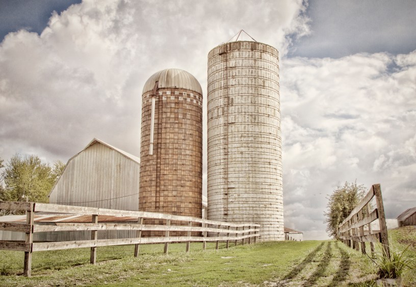 I must say I do love the barns in the Midwest and this one really caught my eye, especially the angle of the shot from the road. I liked the lines of the fence and its shadows on the ground, the fluffy clouds, as well as the towering height and the textures in the silos. I knew it had some potential.